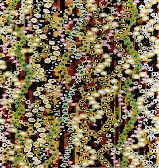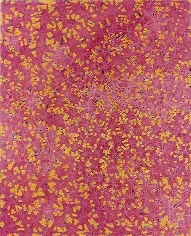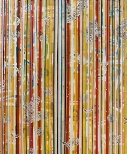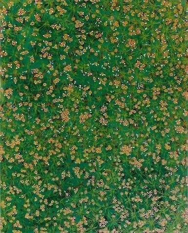 In these works, by using a repetition of circles and lines the paintings in Dreaming High comprehend the canvas as a space where organic symmetrical and asymmetrical fields are intertwined. This is done by blurring the boundaries between the background and the foreground as the forms are layered on top of each other, playing with the macro and micro imagery of what could be nature and artifice.